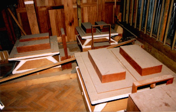 Em cima, vistas do Interior do Grande Orgão e Expressivo 1- Substituição do sistema de ar, 2- Colocação de um ventilador electrico, 3- Substituição do grande fole por 3 foles mais pequenos, 4- Reparação dos someiros, 5- Substituição de peles e algumas madeiras 6- Reparação dos tubos, e substituição de alguns, por novos tubos. 7- Mudança do órgão de parede lateral, ao centro da Igreja, para o Coro.