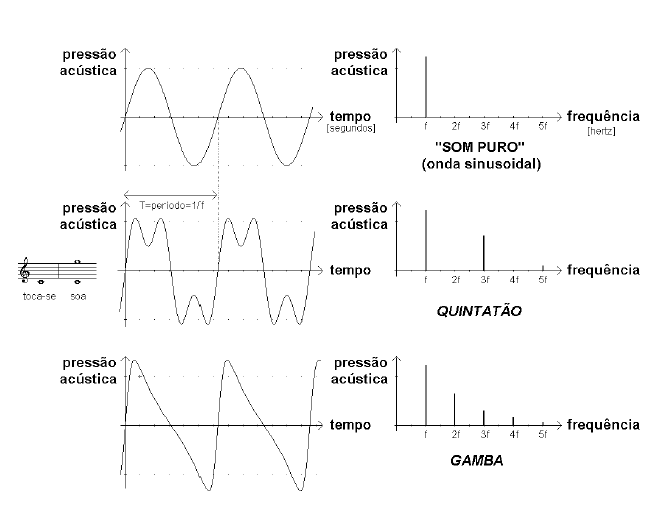 P11: Muito interessante, Mestre. Mas, voltando aos tubos labiais, o da direita naquela figura parecia tapado. Porquê? R11: Os tubos labiais existem nas variantes de aberto ou tapado, sejam eles feitos de madeira ou de metal (liga de estanho e chumbo). Ao tapar-se a extremidade de um tubo labial tem-se como consequência directa que o som obtido soa uma oitava abaixo do que soaria num aberto do mesmo comprimento (basicamente porque a onda pode reflectir na extremidade e percorrer o caminho de volta em direcção à boca, acabando por percorrer a mesma distância que no caso dum aberto). Isto permite realizar órgãos mais compactos e económicos, facilitando a instalação de tubos dentro de caixas expressivas, por exemplo, ou usando-se para os registos graves da pedaleira (um tubo aberto de 16’ mede quase 5 metros, contra 2,5 dum fechado). Mas não são só vantagens! Uma característica acústica de qualquer tubo tapado é que apenas pode produzir harmónicos de ordem ímpar (1º, 3º, 5º, etc.), pelo que um tubo fechado será sempre menos brilhante por natureza que um tubo aberto. Claro que esta questão não se deve colocar apenas no campo das vantagens e desvantagens, devendo também ser visto como mais um meio para se obter variedade tímbrica. Por exemplo, o Quintatão é um registo de metal tapado que existe em 16’ ou 8’ e em que o 3º harmónico (quinta mais uma oitava acima da fundamental) está muitíssimo presente. No domínio do tempo e da frequência, um registo deste género, versus um hipotético gerador de sons puros sinusoidais (som sem harmónicos de ordem superior) e versus um registo brilhante como a Viola da Gamba têm, aproximadamente, o seguinte “aspecto”: